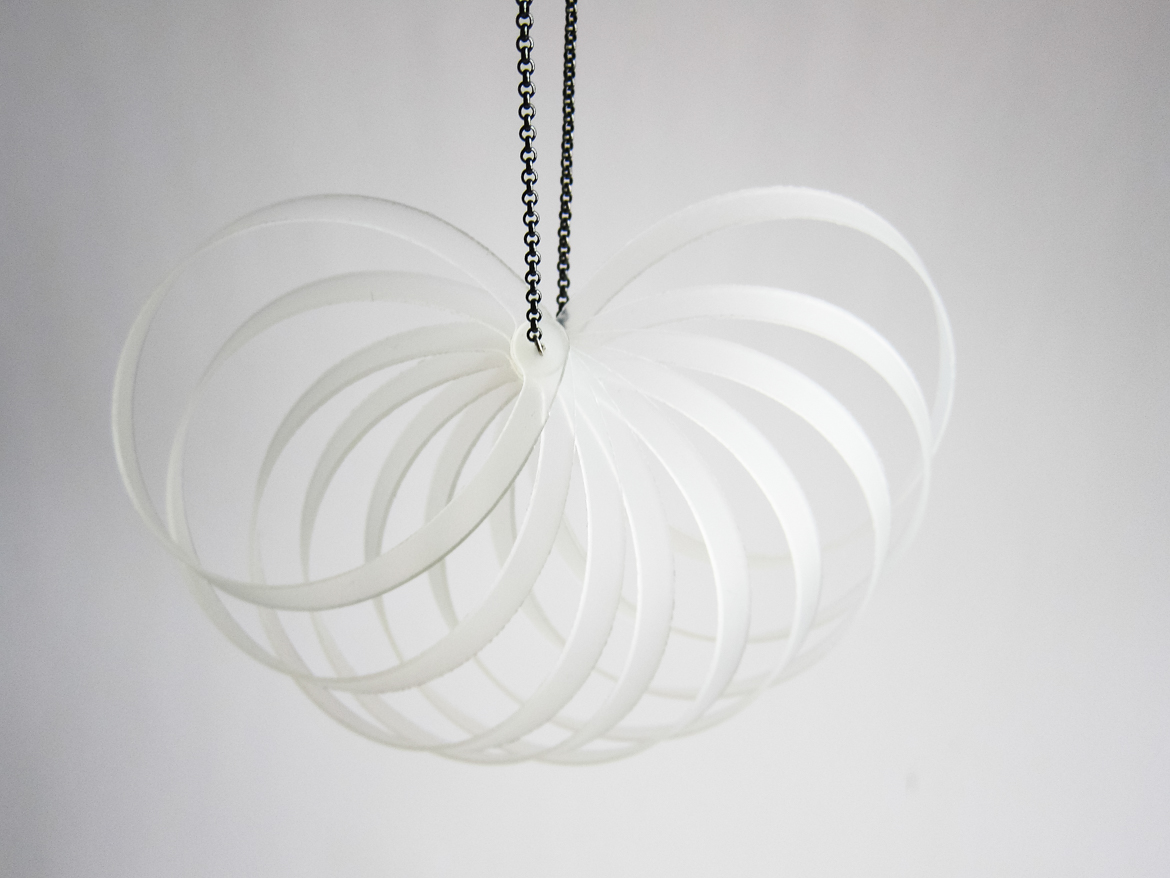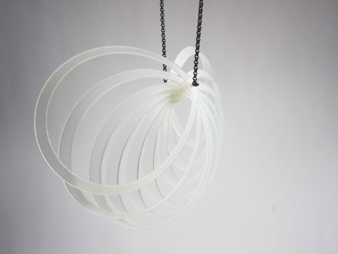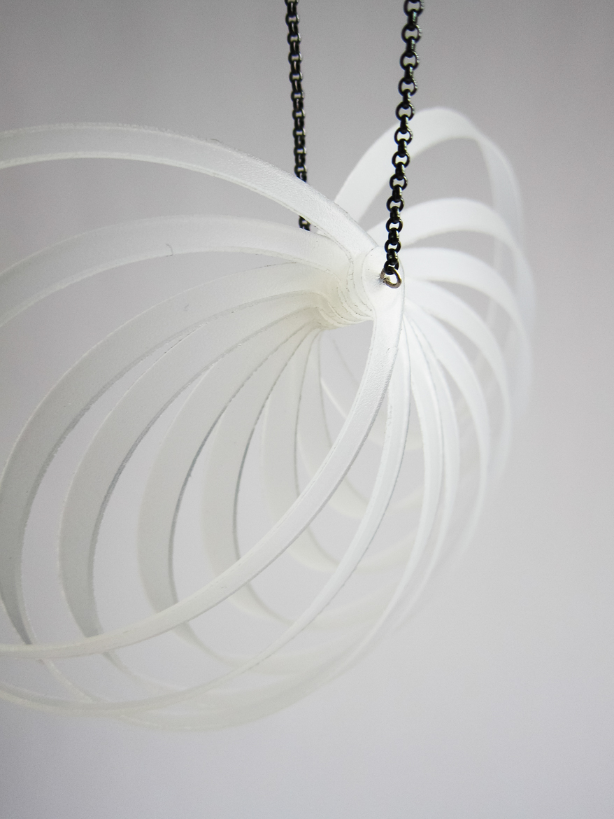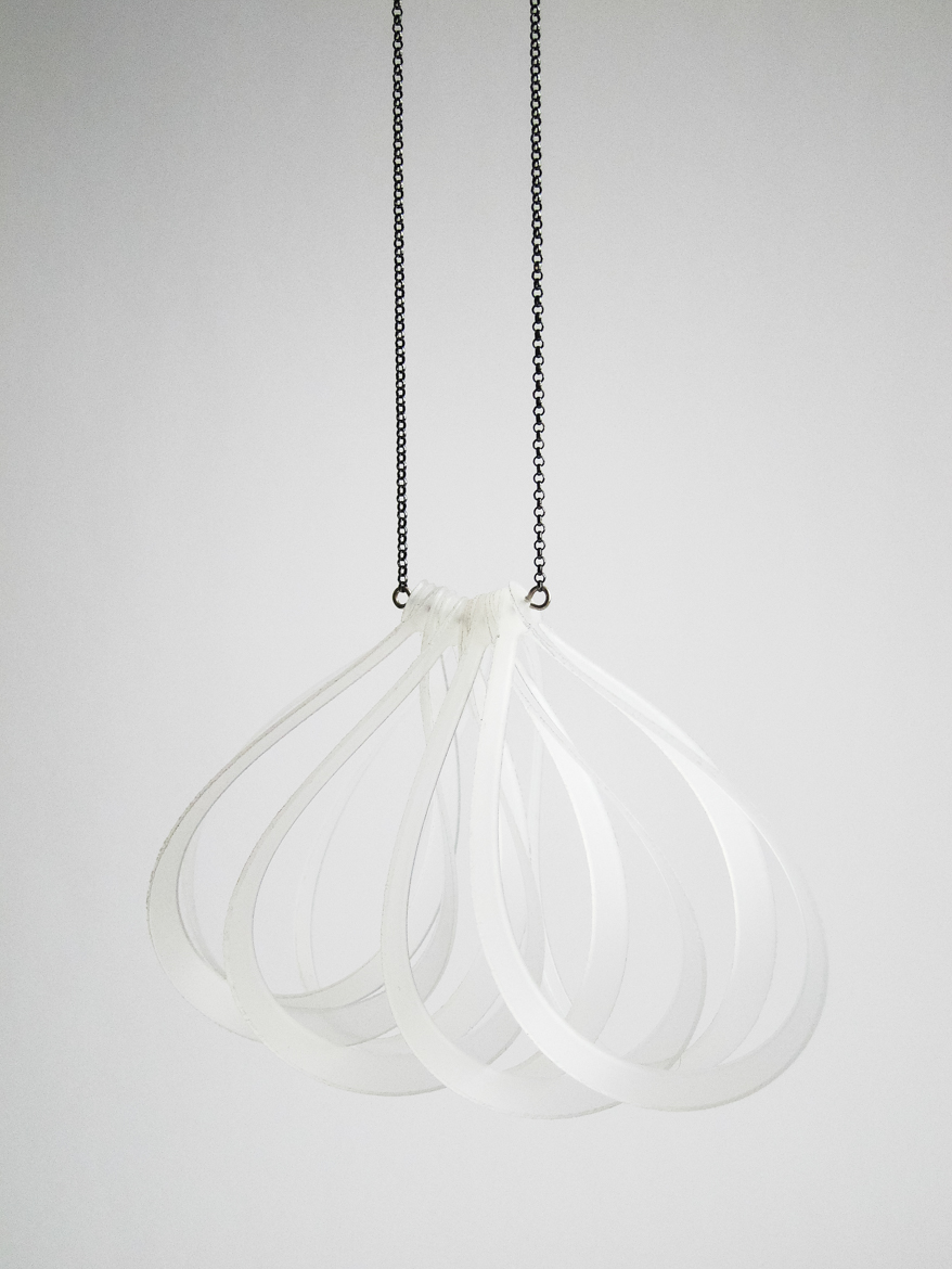 Vuonna 2012 muovista ja hopeasta valmistetut kaksi isoa kaulakorua.